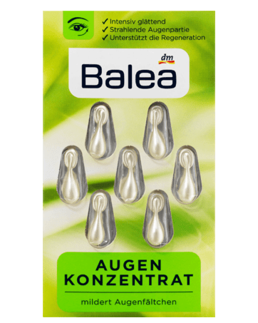 Viên nang dưỡng da vùng mắt Balea Konzentrat Augen có thành phần chiết xuất trà xanh, Kalpariane, vitamin E và dầu hoa anh thảo. Giúp cung cấp độ ẩm và dưỡng chất nuôi dưỡng vùng da quanh mắt. Làm giảm độ sâu của các nếp nhăn, hỗ trợ tái tạo và làm mịn da. Cho diện mạo trẻ trung rạng rỡ.